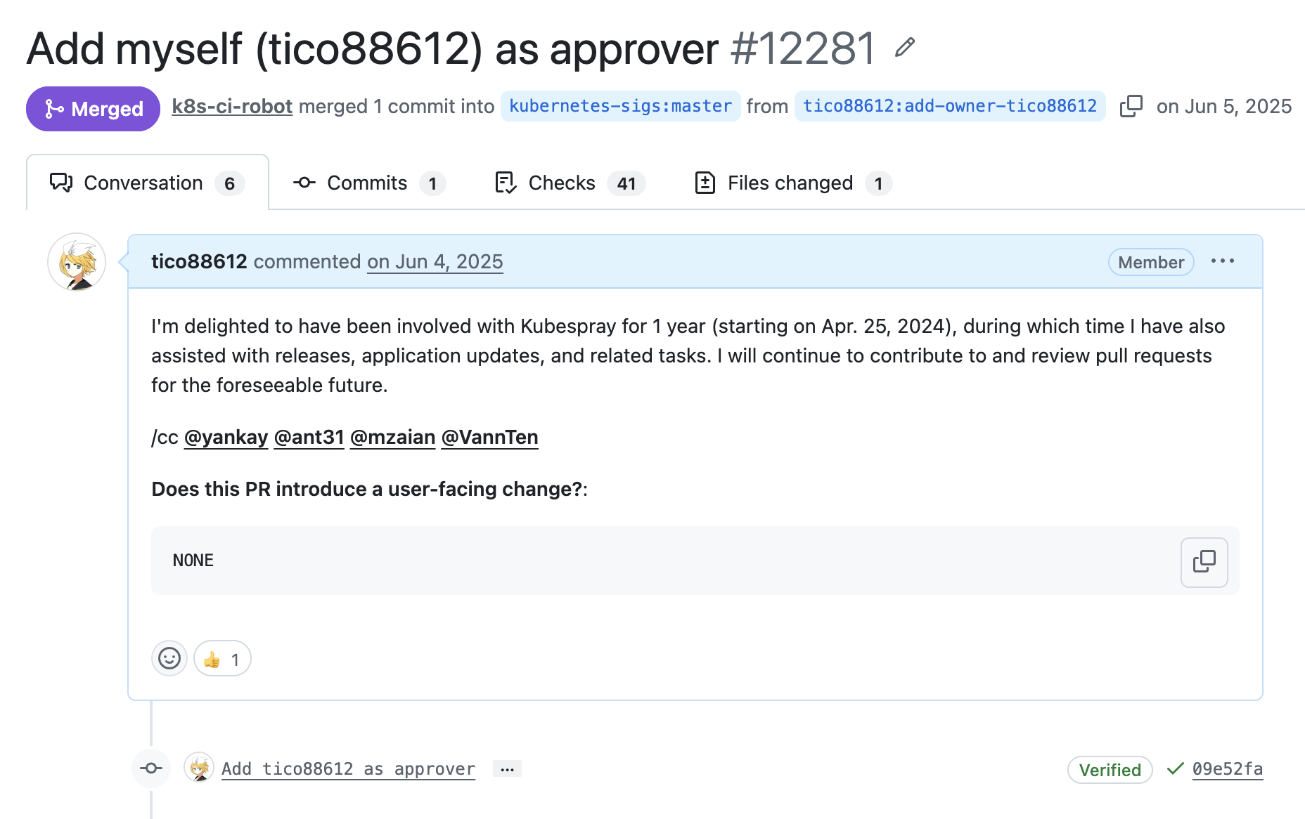 成為 reviewer 以來,每天都認真審閱 PR,累積下來其實不少,總算到今年 6 月受到其他 approver 邀請,並成為 Kubespray 的 Release Manager。