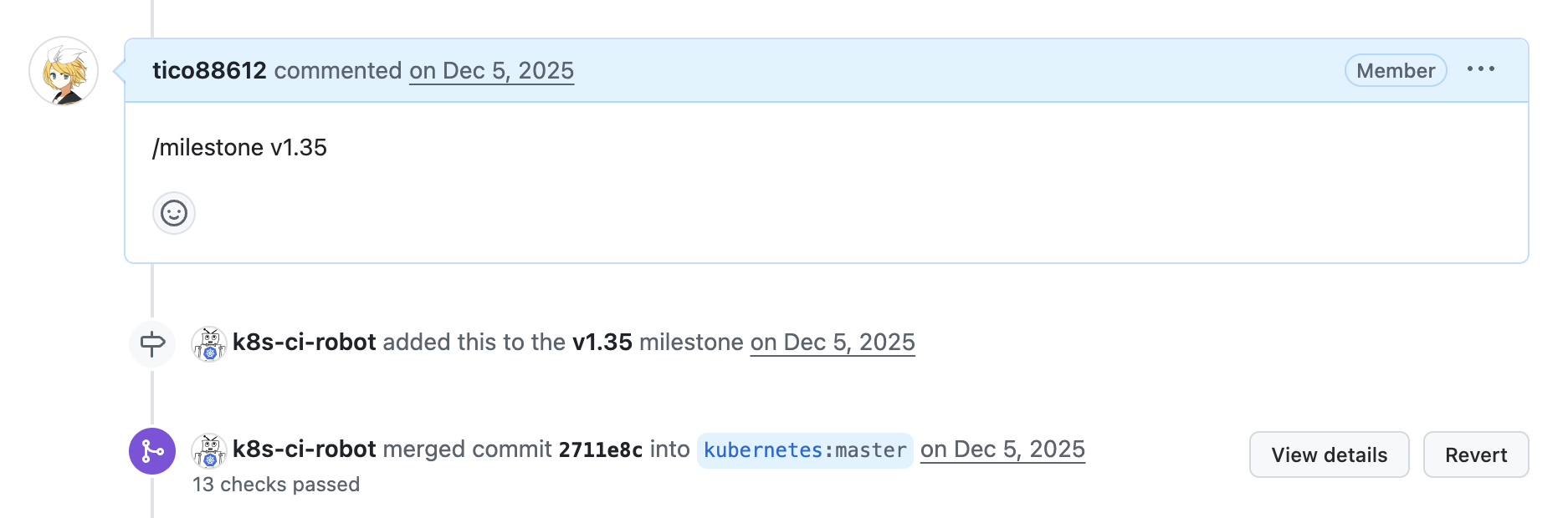 大約在程式碼凍結 (Code Freeze) 和測試凍結 (Test Freeze) 前 4~5 週,預計要在這次 release 解決的 Issue 或 PR 都會打上 milestone。需要跟該 Issue 相關人員和 PR 作者提醒「我們會在 X 月 X 日 code freeze,請把握時間把相關 PR 打上 /lgtm 和 /approve,如果有需要其他協助請跟我們聯繫。」