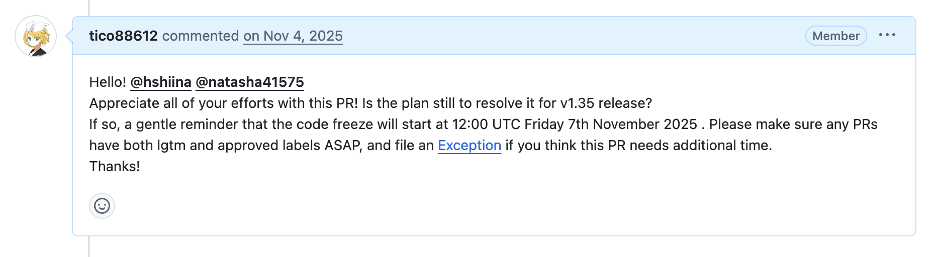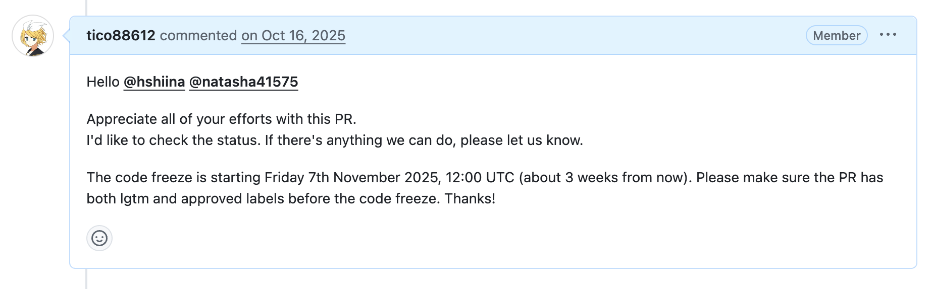 然後 Code Freeze 前 3 ~ 4 天要再傳一次訊息提醒那些有該版本的 milestone 還沒關閉的 Issue 和尚未處理的 PR(不包含已經有 /lgtm 或 /approve),說「已經剩下 X 天就要 code freeze,如果需要延後請發送 Exception 請求」