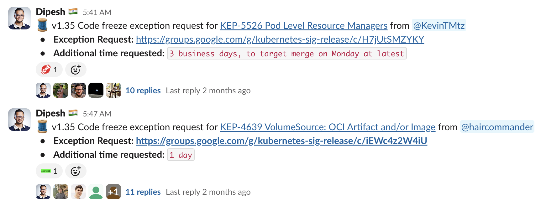 Exception 請求會傳到 Release Lead 團隊,同時該請求的 SIG Lead 也要附議,Release Lead 團隊會評估時程、進度等,給予 APPROVING 或 REJECTING。