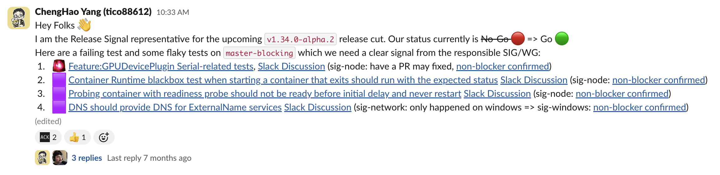 這個 cycle 期間會有數次的切版,包含 alpha、beta、rc 等,每次要切版的前 3 天,就要傳訊息到 #release-management 確認能不能切版。基本上需要等對應的 SIG 成員或 lead 出來回覆是否為 release blocker。