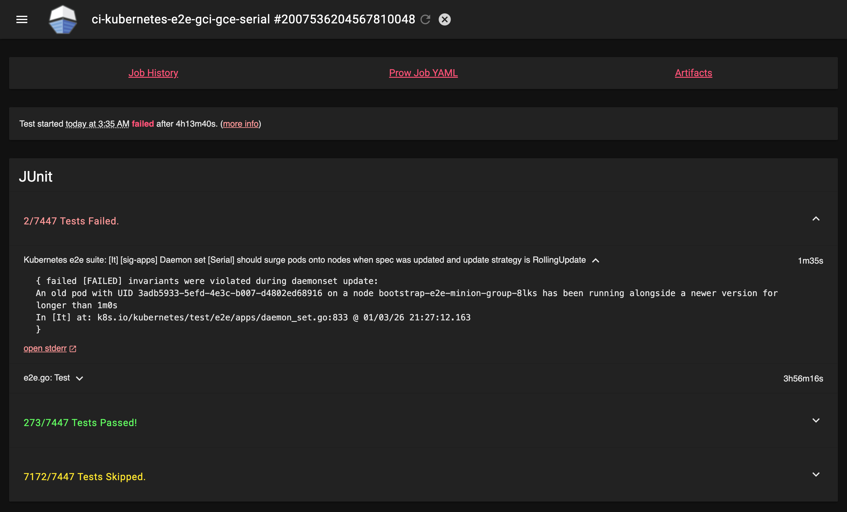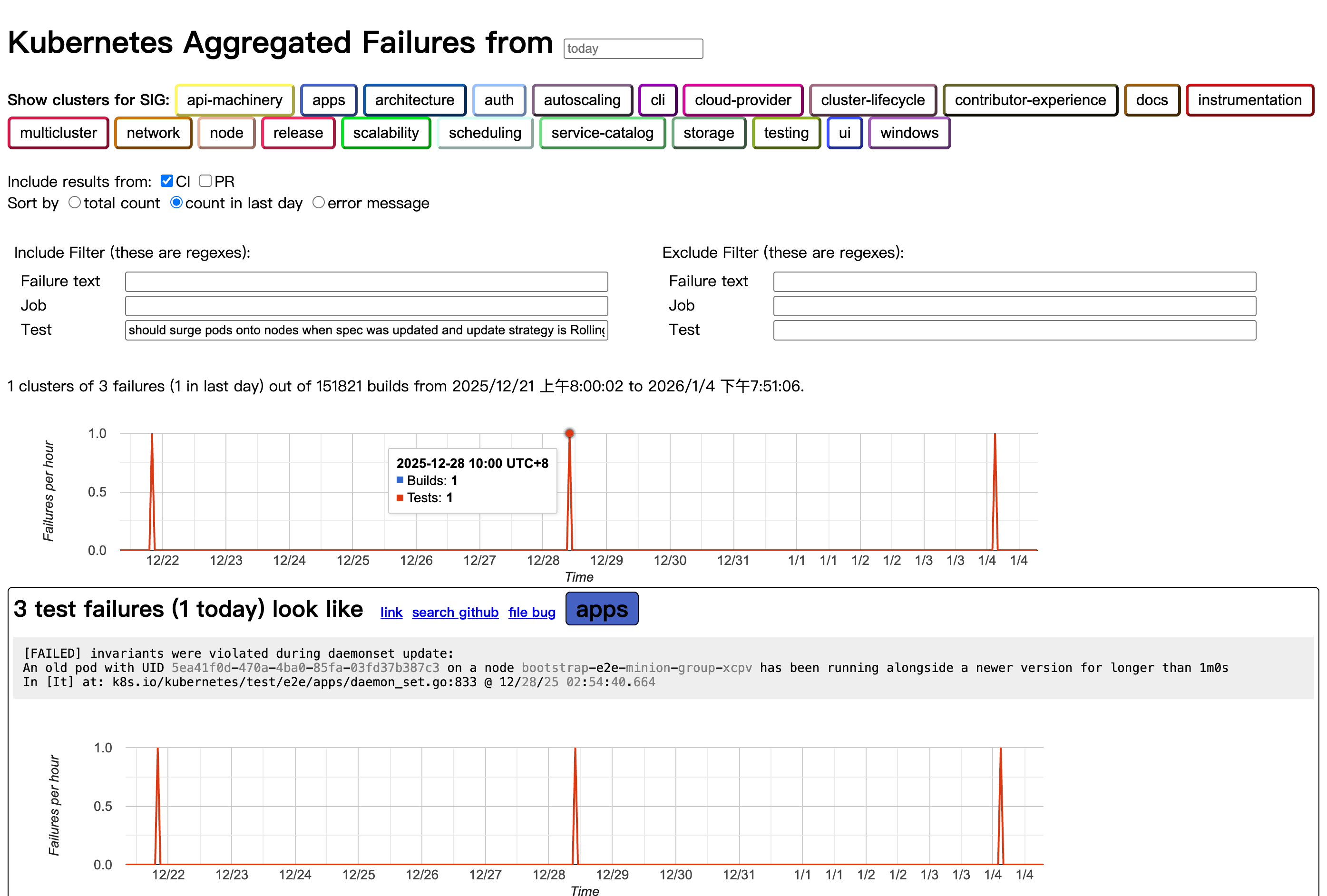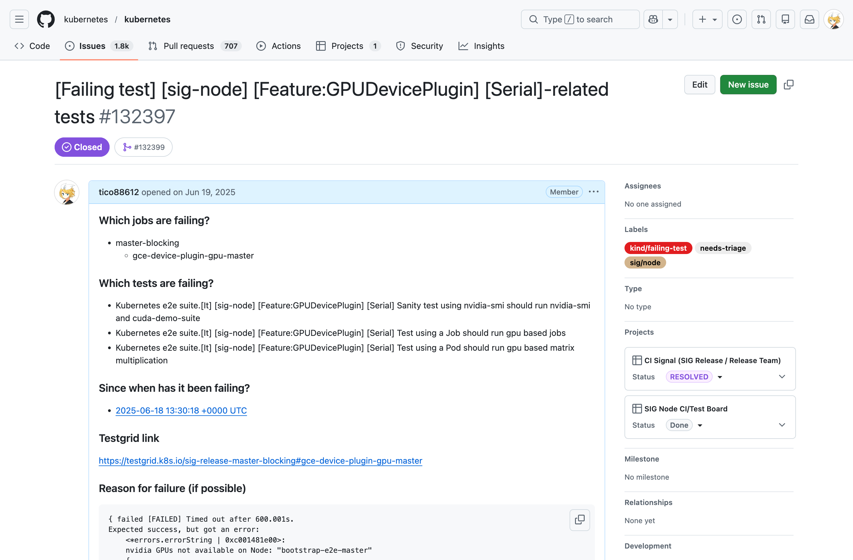 issue 內容通常會描述異常發生的 dashboard、對應的測試項目、首次出現的時間點,以及實際觀察到的錯誤訊息,並在可能的情況下補充初步的背景或推測原因,讓後續接手 triage 的人能快速理解問題脈絡。實際撰寫方式可參考像是 kubernetes/kubernetes#132397 這類範例。