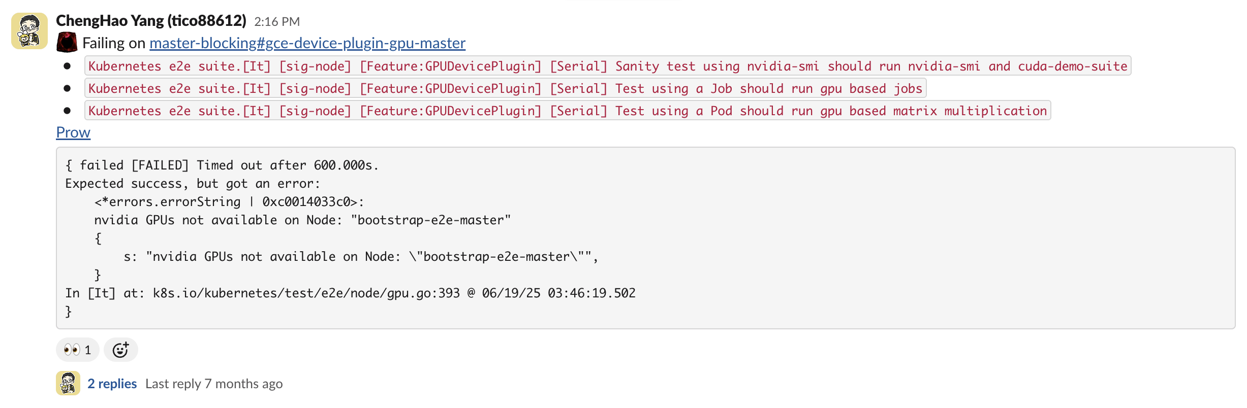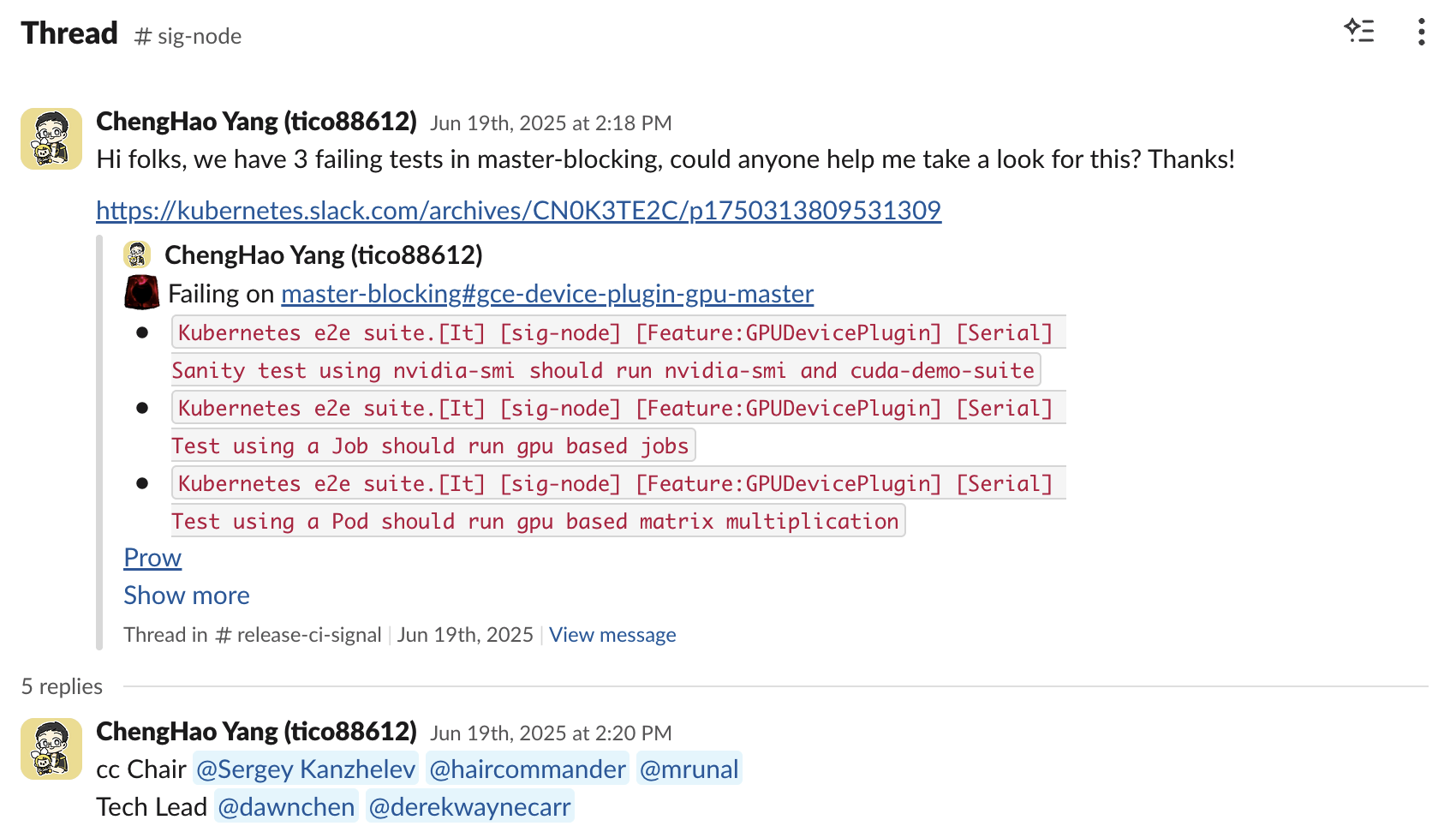 由於並非所有 SIG 成員都會即時關注 #release-ci-signal,在確認影響範圍後,Release Signal 也需要將相同訊息轉發至對應的 SIG Slack 頻道,並標記 SIG Lead 或相關 maintainer。以上述 issue 為例,錯誤與 node 行為相關,因此會同步回報至 #sig-node,確保負責該領域的 SIG 成員能及早介入處理。