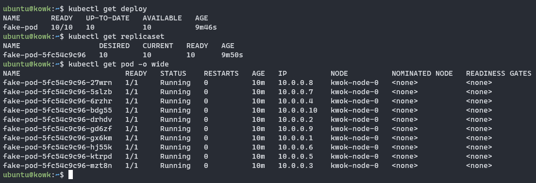 目前這樣初步玩下來覺得 KWOK 是還蠻不錯的模擬器,這樣測下來結果該有的都有,這工具個人覺得蠻適合剛入門 K8s 的人,或者想測試一些多節點的特殊玩法,不用怕測失敗把整個環境搞爛花時間重建,如果想要模擬上千節點情況也不需要昂貴的硬體設備。