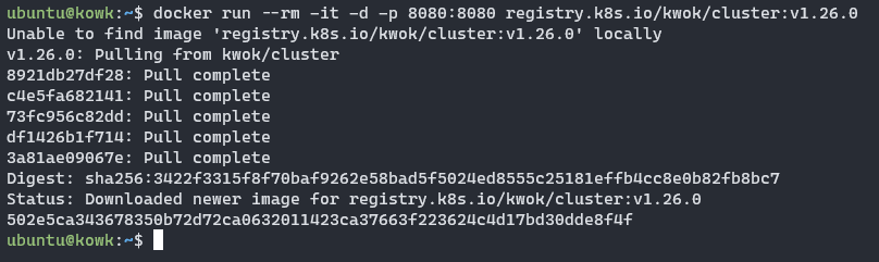 docker run --rm -it -d -p 8080:8080 registry.k8s.io/kwok/cluster:v1.26.0