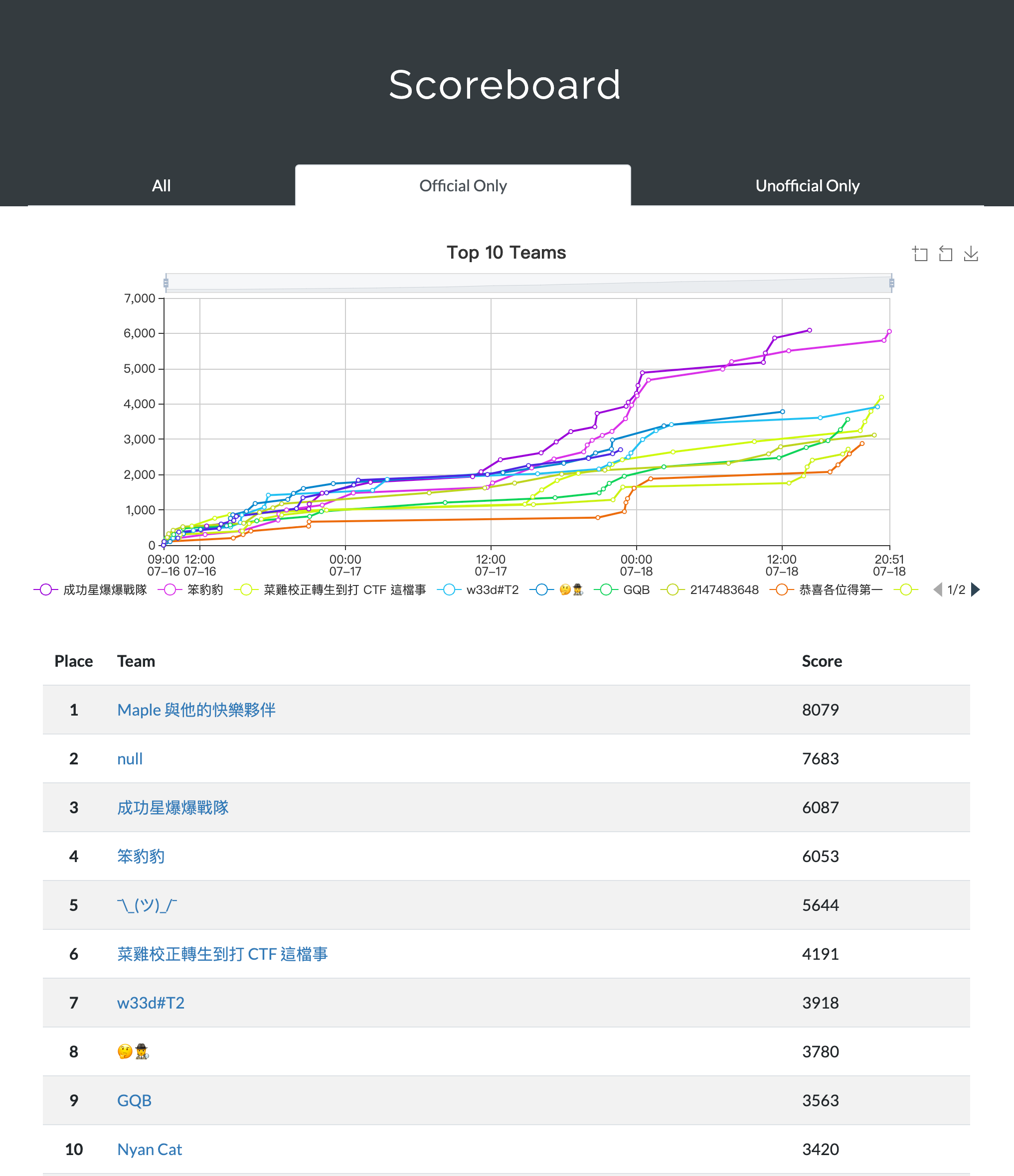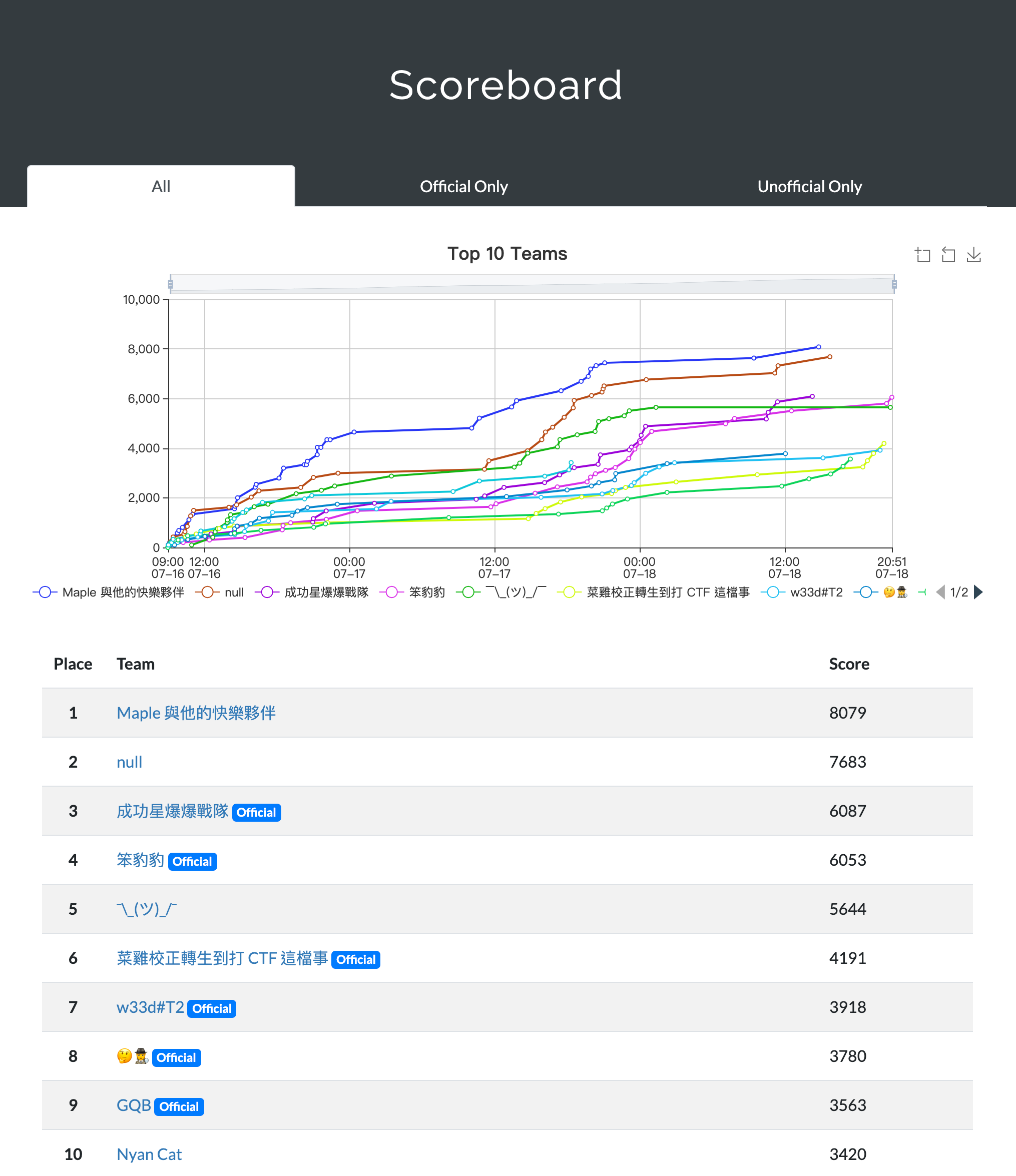 謝謝隊員們陪我一起打 CTF,我也學到蠻多東西。 waig548 直接一人單幹 2000 多分,真的很猛,本隊 MVP 實屬他。 waig548 的 Writeup 連結