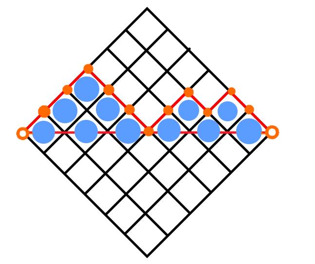 令$dp[i][j]$代表第$i$斜排他的長度要是$j$時的方法數 $dp[i][j]=\sum_{k=j-1}^{i-1}dp[i-1][k]$ 因為會發現若是這裡要擺長度為$j$那前面最少要擺長度$j-1$,所以可以枚舉前一斜條擺放的數量來計算這個狀態的方法數。 而對於n個斜條的總方法數,只要再枚舉最後一斜條有幾個人就好了。